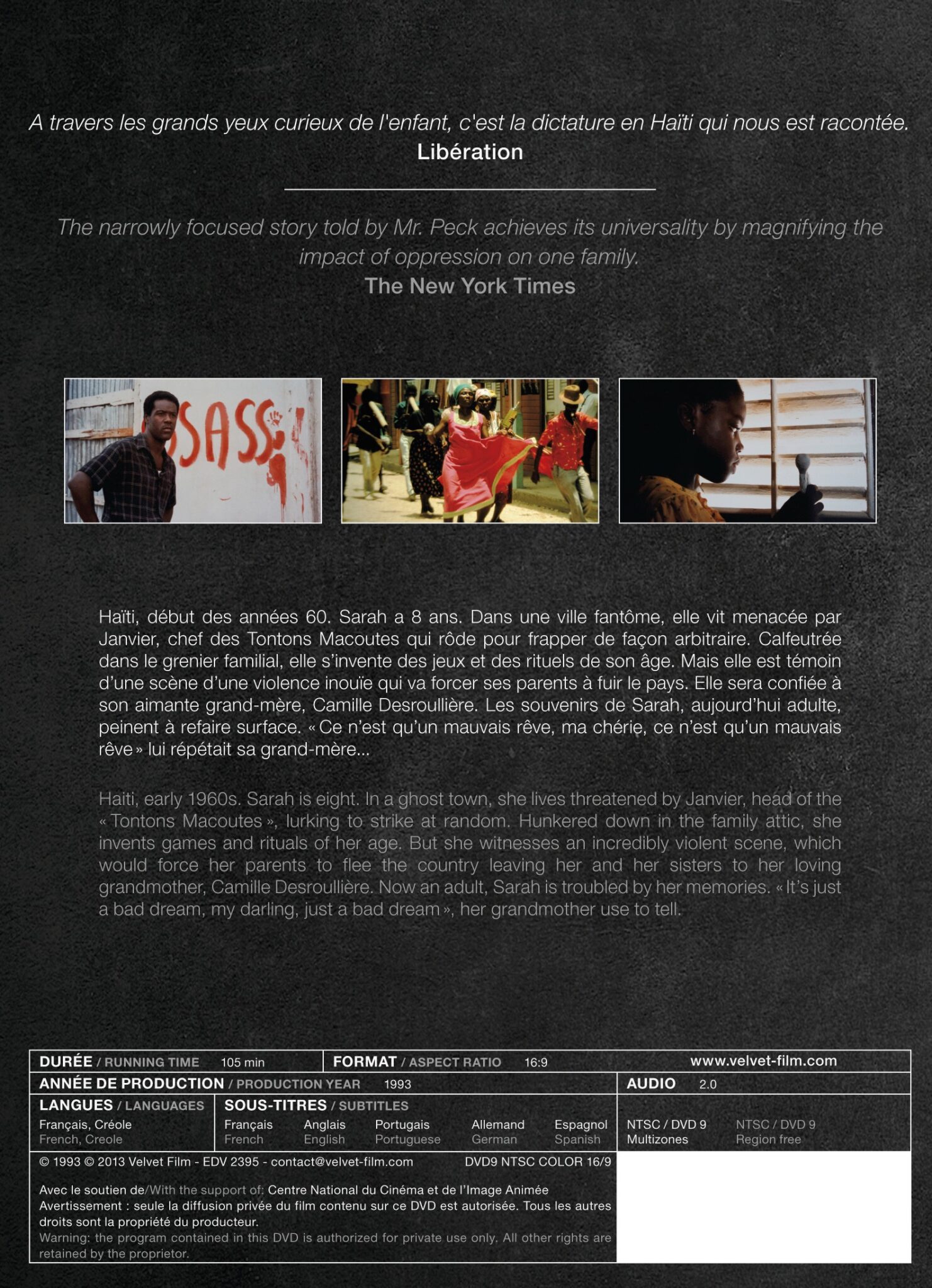 Haiti, early 1960s. Sarah is eight. In a ghost town, she lives threatened by Janvier, head of the “Tontons Macoutes”, lurking to strike at random. Hunkered down in the family attic, she invents games and rituals of her age. But she witnesses an incredibly violent scene, which would force her parents to flee the country leaving her and her sisters to her loving grandmother, Camille Desroullière. Now an adult, Sarah is troubled by her memories. “It’s just a bad dream, my darling, just a bad dream”, her grandmother use to tell.