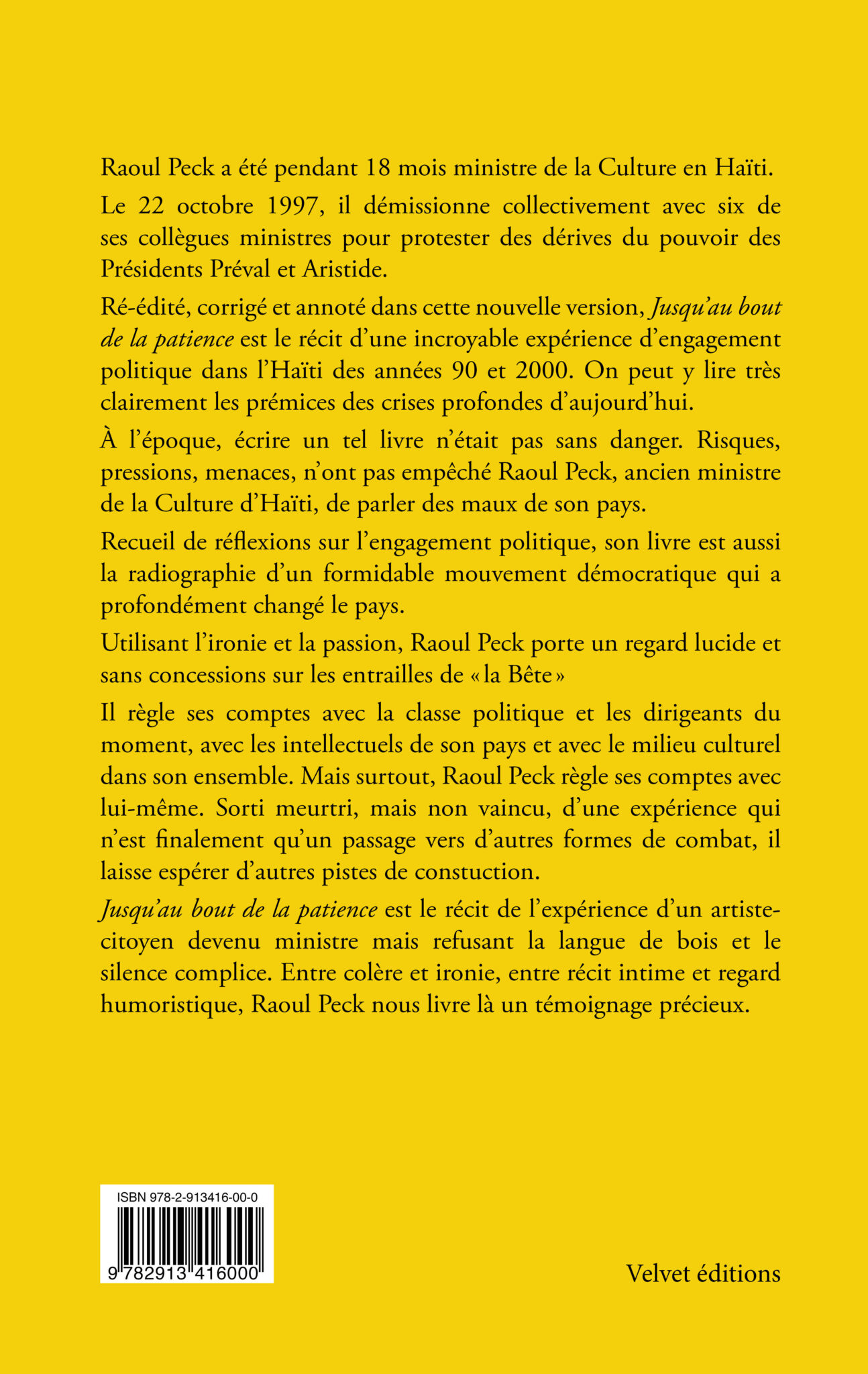 Jusqu’au bout de la patience est le récit de l’expérience d’un artiste-citoyen devenu ministre mais refusant la langue de bois et le silence complice. Entre colère et ironie, entre récit intime et regard humoristique, Raoul Peck nous livre là un témoignage précieux.